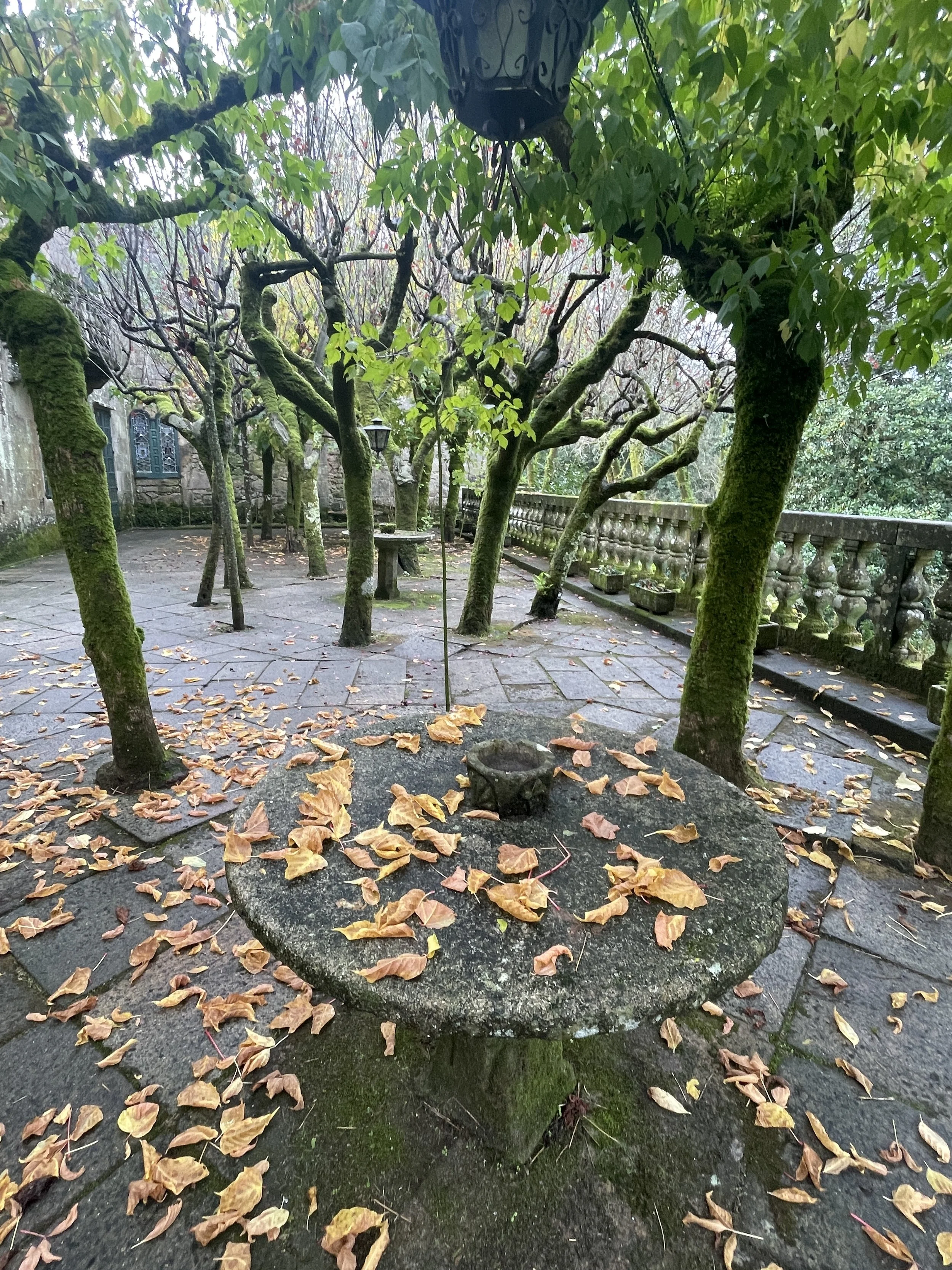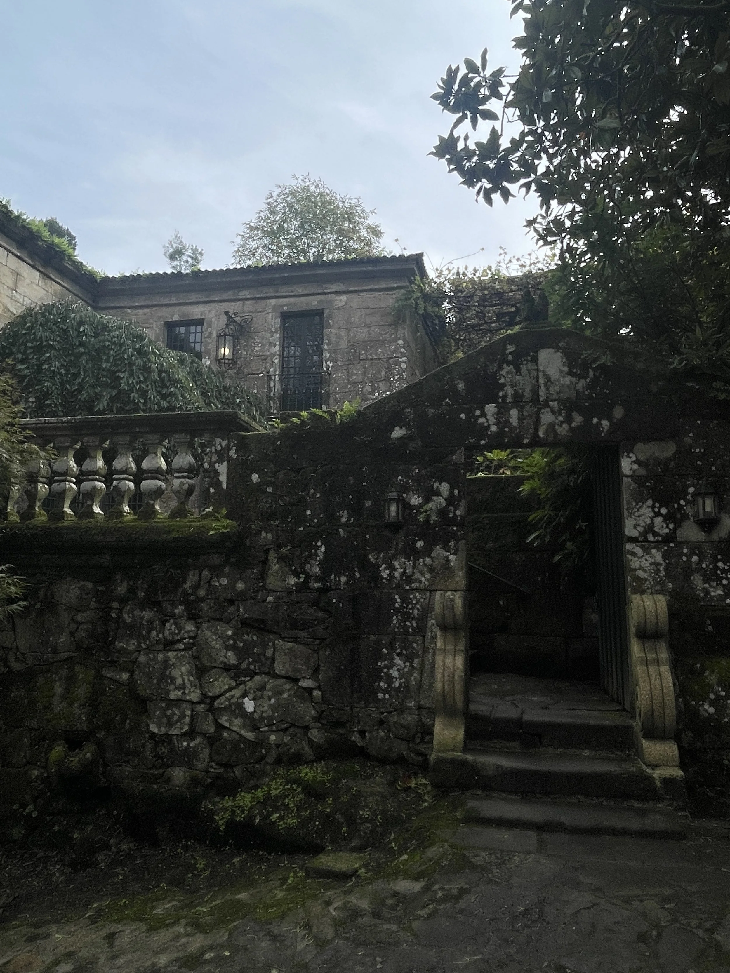 As we drove down the main street, we noticed pilgrims walking the Camino and wondered if we'd be able to spot the pazo nearby. We continued towards the woods and found a gravel parking lot with one other car, situated next to a beautiful forest with Japanese maples and the sound of a river rushing nearby. We pulled in and noticed a large gate and an old stone wall up the path.