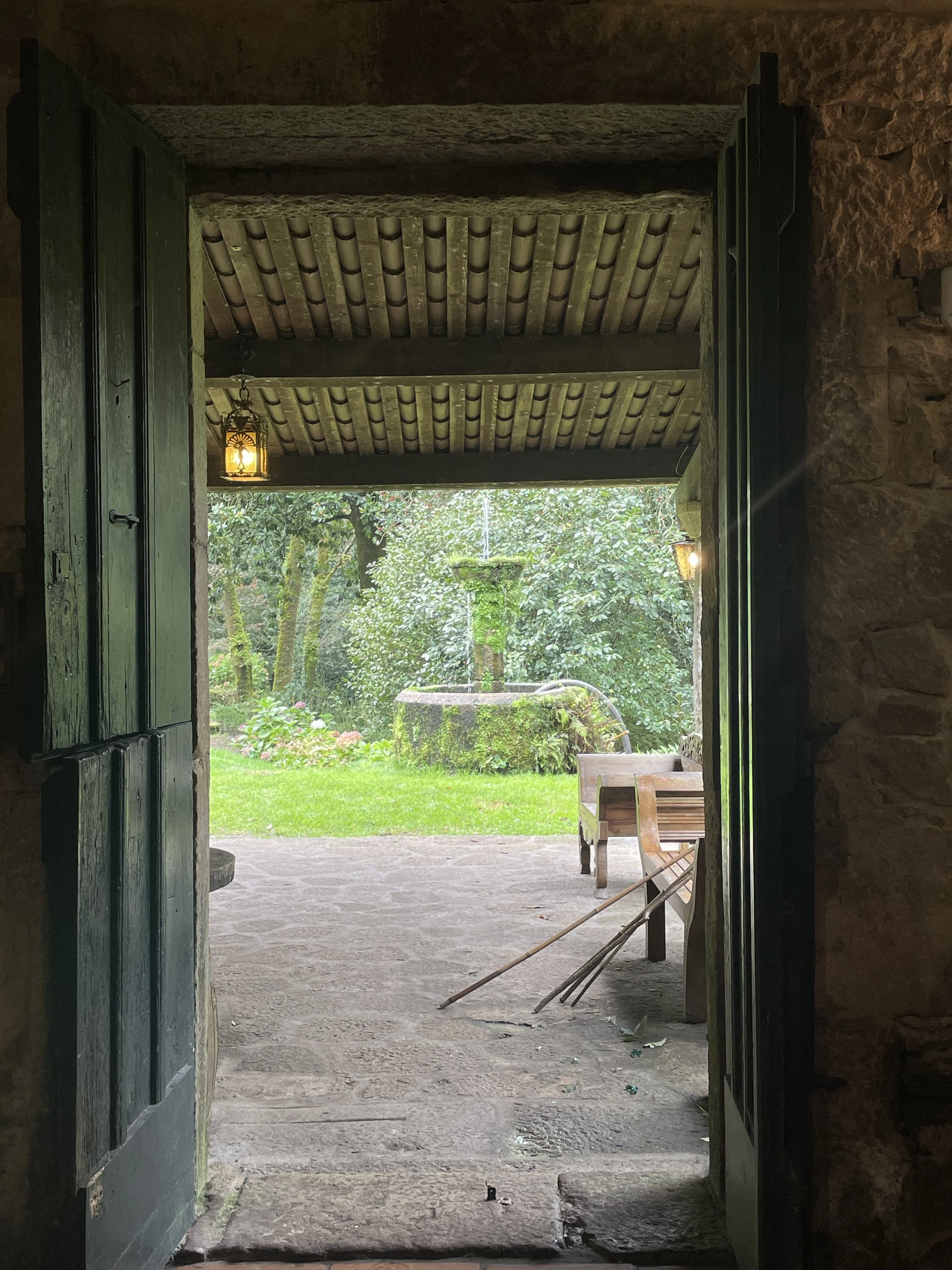 Once inside the gate, the entrance was lined with grapevines with small lanterns hanging below. To the left were two very old apple trees and hydrangeas, and a pool hidden beyond the trees, covered in green algae. The woman left us to explore the grounds while she went to get an audio guide in English for our now private tour. It was helpful in understanding the history, and we tried to ask as many questions in Spanish as we could. She was very patient, kind, and knowledgeable about the property.