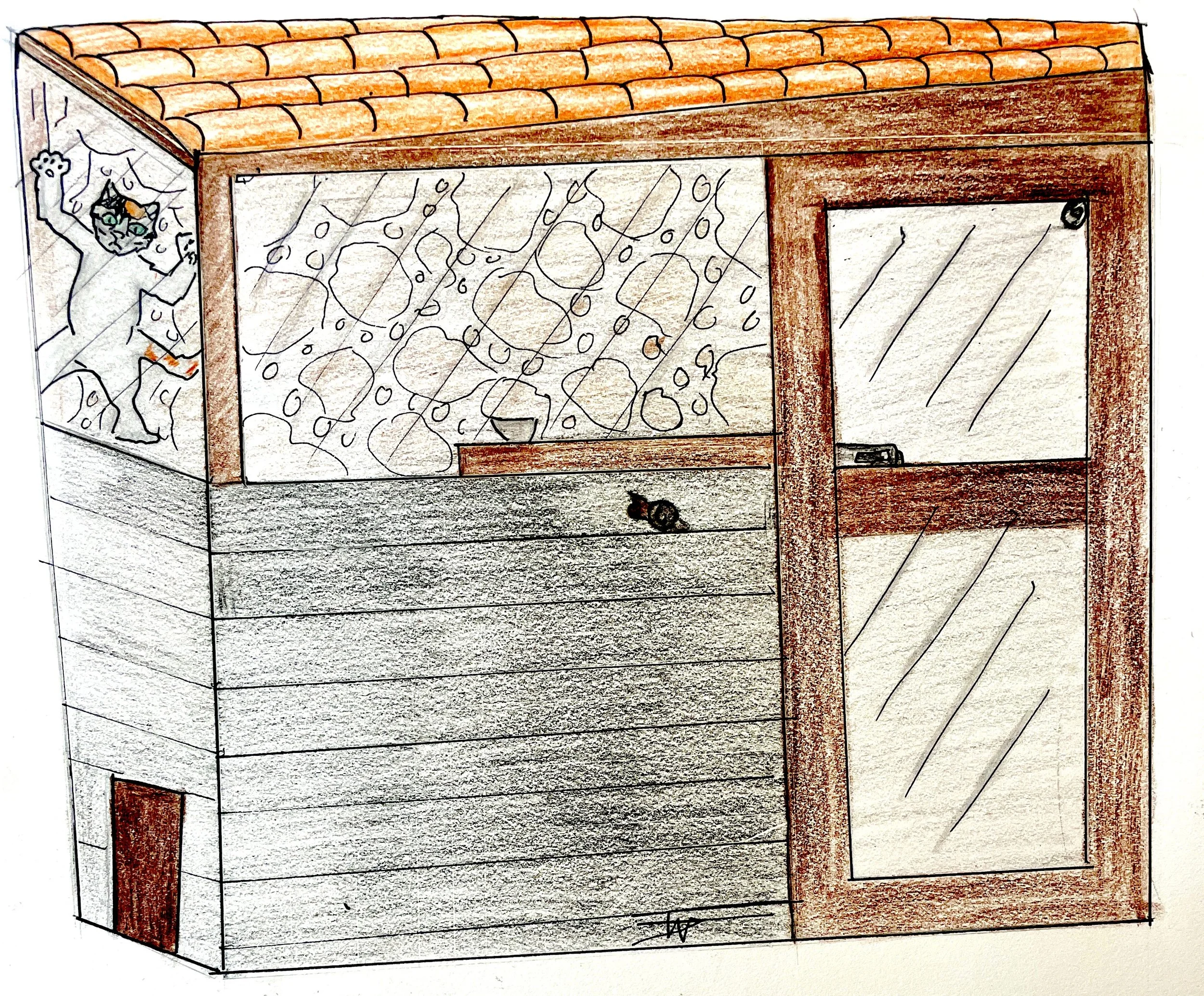 Much to my surprise, a small opening at the corner of the window allowed her to jump through, and she was now sitting on the ledge in the tool shed. I peaked in and saw her trembling with fear behind our pool cover.