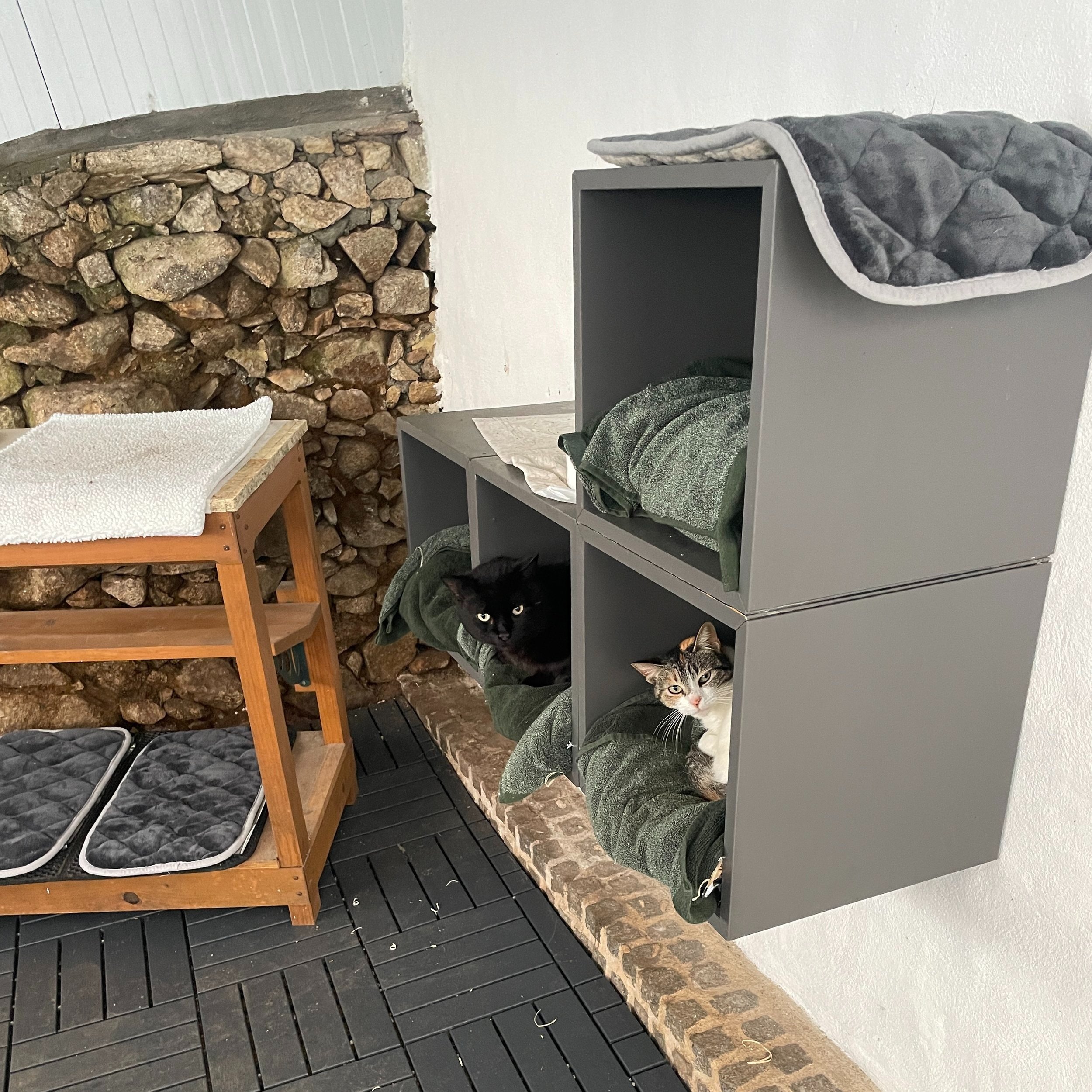 In the morning I provided room service to the residents of our hotel. Luckily when I went out to feed them, there was little Mamá G in the cubby and Smokey on the table waiting to be fed. I went in, fed them and closed the door behind me, trapping both of them in. After they finished eating I let Smokey out leaving her in there all day and would come back later to feed her.