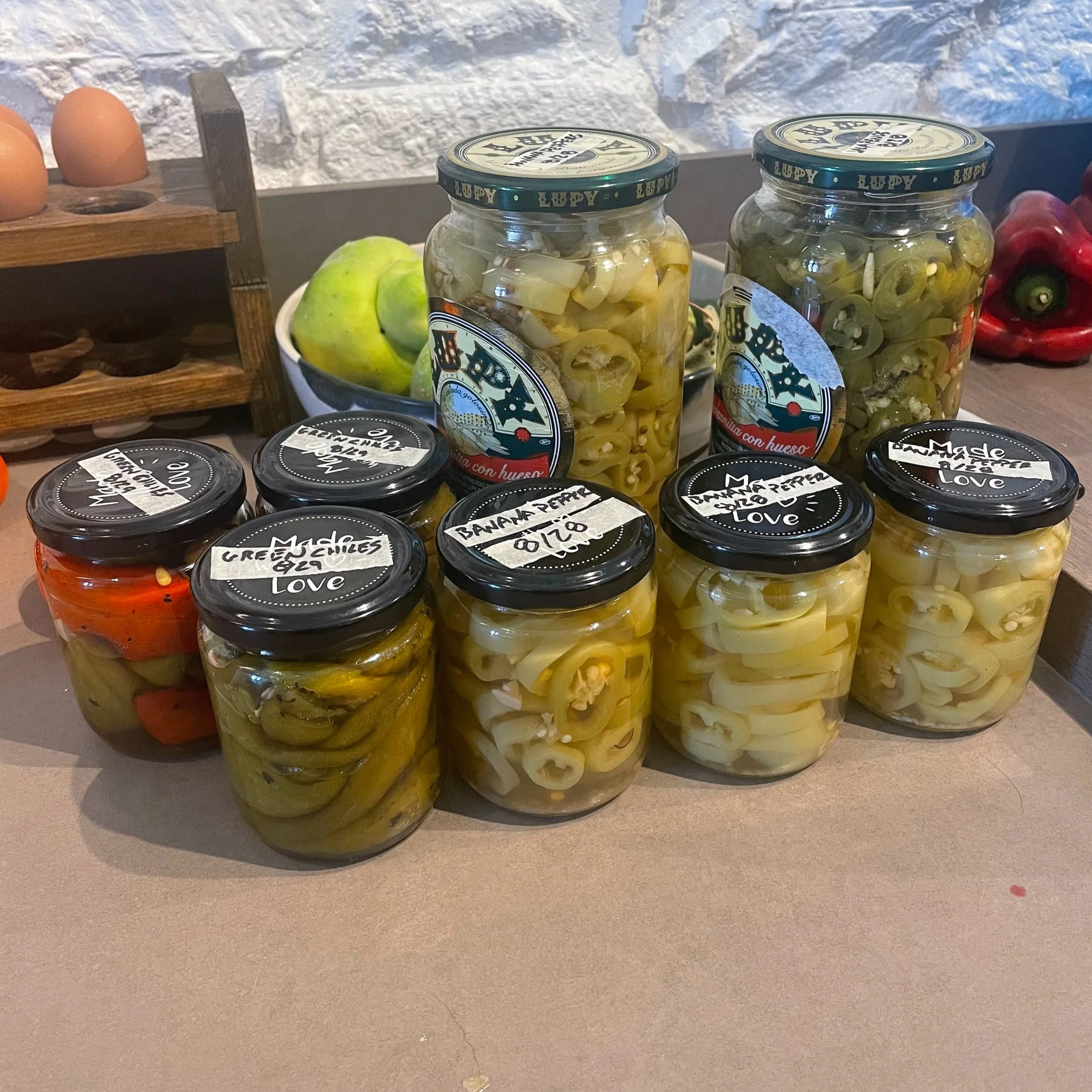 With Kyle’s massive pepper harvest, he roasted all of the green chilis and froze them, made single portions and froze green chili stew, and canned lots of different types of jalapenos, banana peppers. He also preserved tomatoes to have stewed ready to use for pasta sauce, Spanish rice, chili and lots more.
