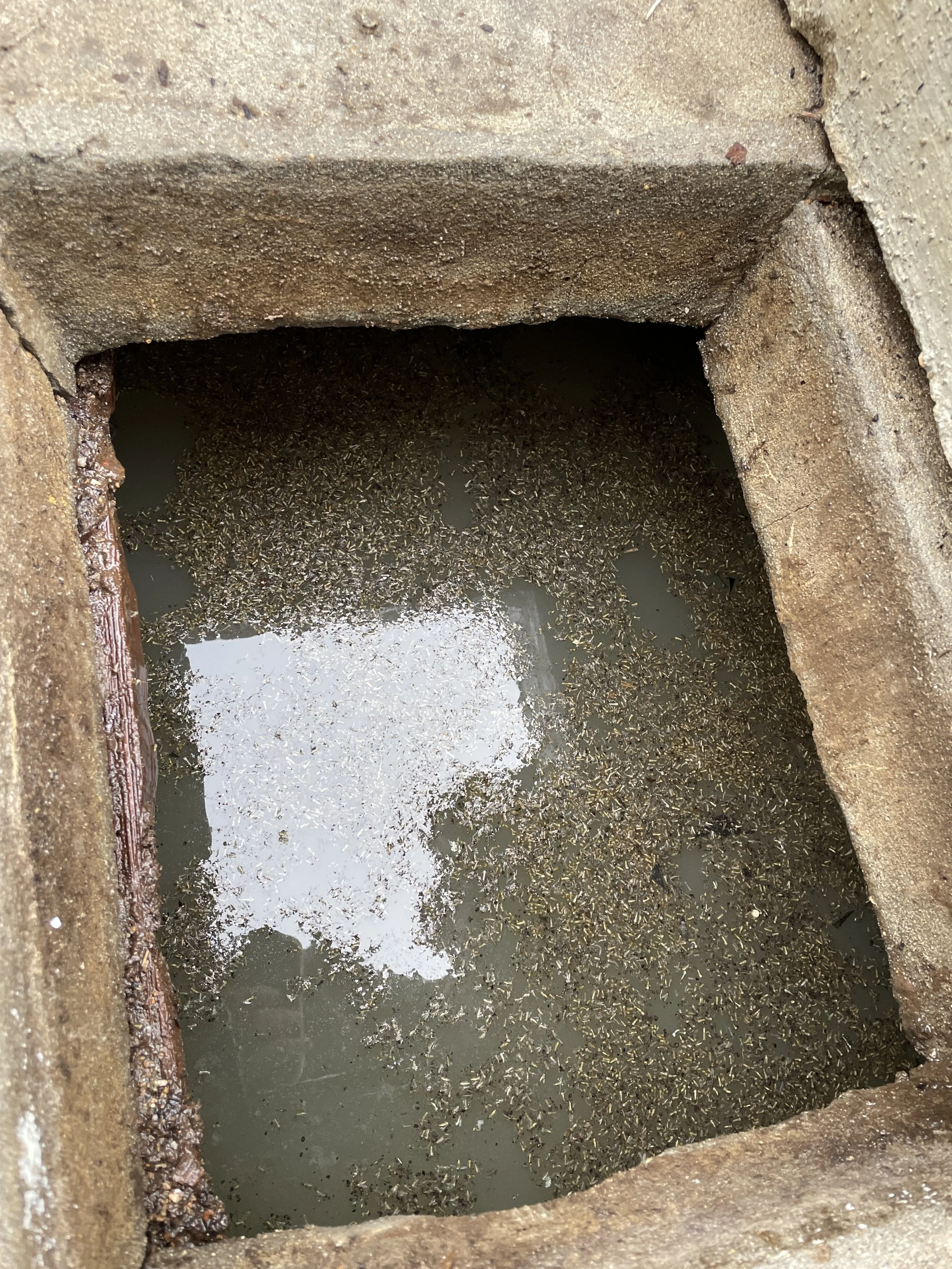 Kyle lifted the wood planks that covered the tank and found there were cracks all along the top of the concrete where the mosquitoes would make their escape. He got some spray foam and tried to seal all the cracks, the only problem was, it wouldn’t stop raining long enough for it to dry! The rain just kept coming and the mosquitos had babies to feed.